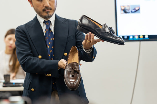 先ほどの<J.M. WESTON>のものと同じく非常にエレガントな印象ですね。手前のブラウン(ウォールナットアンティーク)はビームスのカラー別注です。