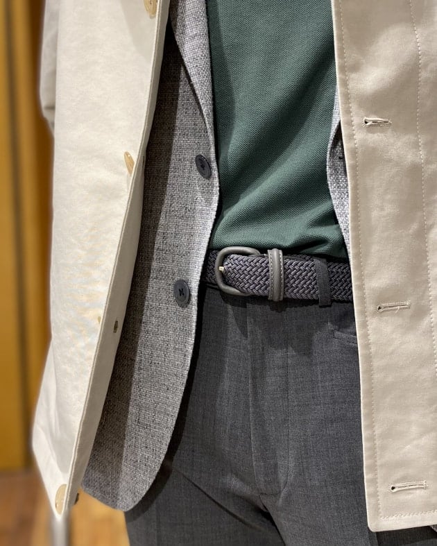 ほんのりアクセントを付けてくれるラバーメッシュベルトもポイント。パンツと同色をチョイスして限りなく控えめに。ものにもよりますが、今回のような軽い装いに対して革のベルトではやや重たく見えてしまいます。