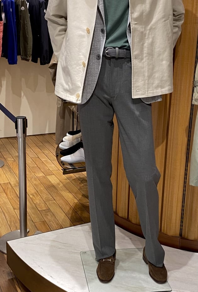 そんなボリュームのある上半身に対して、パンツはスッキリとしたノープリーツのウールスラックスを合わせてスタイリッシュに。