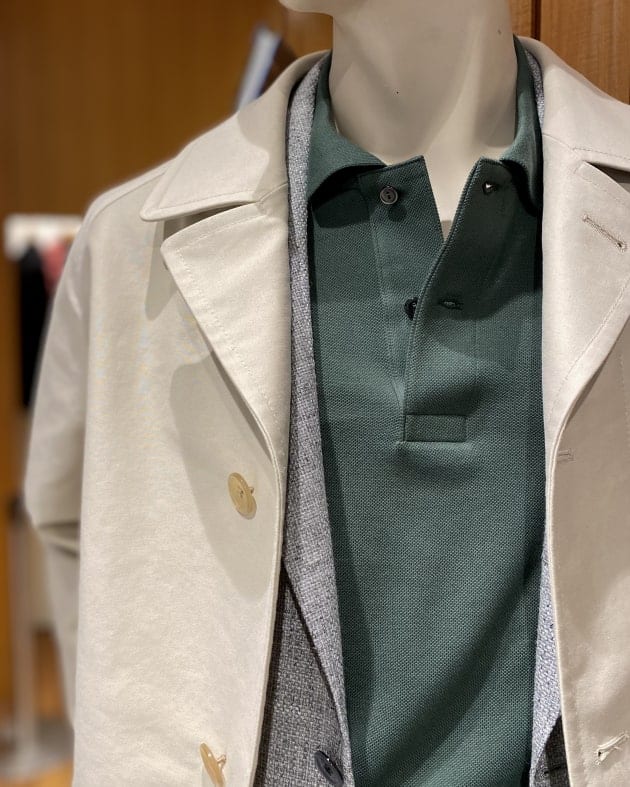 グリーンからグレー、ベージュの柔和な繋がりがボリュームのあるレイヤードスタイルも軽やかな印象に。ポロシャツのグリーンも淡い発色のもので、穏やかなコントラストで力みのない
