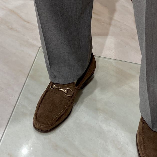 足元はブラウンスエードのビットローファーでマイルドに。ブラックスエードで柔らかくかつ引き締めても良さそうな合わせですね。