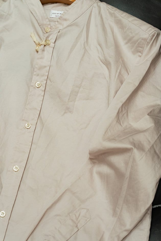 もともと<GUY ROVER>が持っていたバンドカラーシャツをベースに、ゆったりとしたサイズバランスに変更しております。<GUY ROVER>の、特にカジュアルシャツは体感ワンサイズぐらい表記よりも小さいサイズ感でしたので、緩くするぐらいでようやくちょうど良いぐらいになったと言ったところでしょうか。