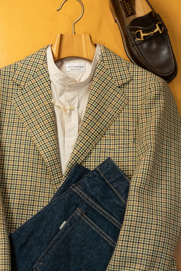 今の時期はタートルネックのカットソーやニットをインナーに、暖かくなってきたらネッカチーフを合わせるといったこともできますので、これぐらいドレス寄りの方がコーディネートのバランスが取りやすいかと。