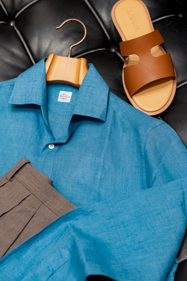 いわゆるビーチサンダルのような形ですが、上質なレザーを載せることによって大人の上品な足元にピッタリの一足に。
