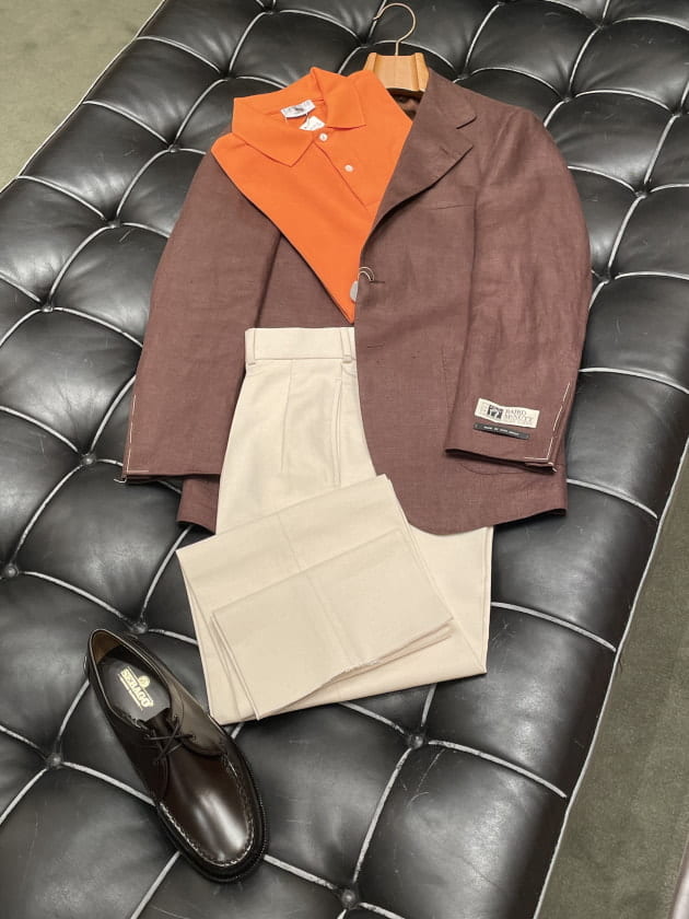 カジュアルなジャケパンスタイルにコーディネートしてみました。トップスはカバーオールなんかで、さらにカジュアルなスタイルでも良さそうです。