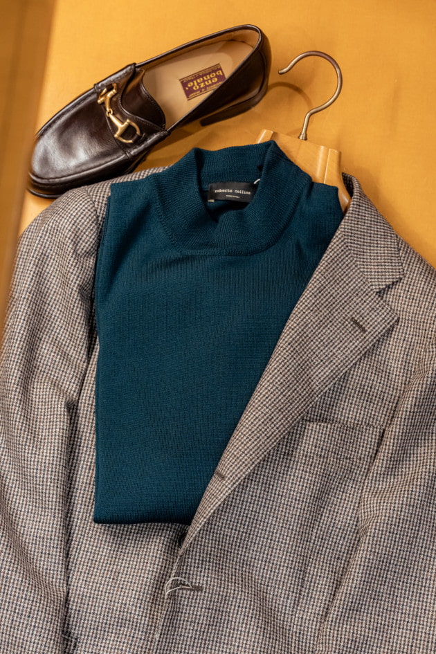 これぐらいのハイゲージのモックネックがハマるスーツだなと思いました。グリーンのニットも相性良いですね。