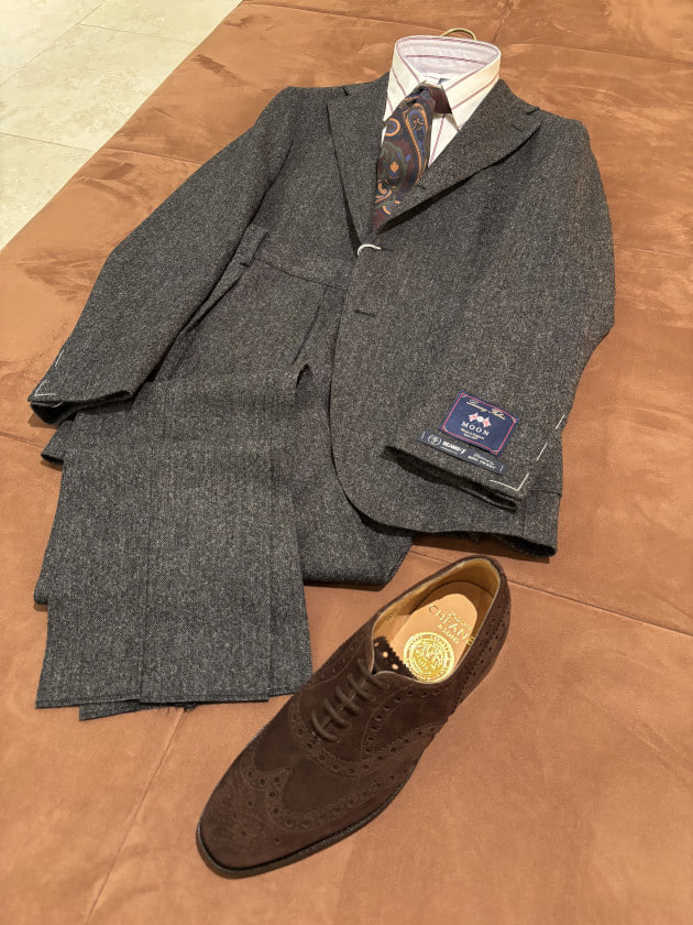 コーディネートイメージです。CHARCOL.Gカラーのスーツに合わせて。シブいですよね。あまりやり過ぎると野暮ったくなっていきますから、Vゾーンや全体のシルエット感は少し気を使った方が良さそうですけども。