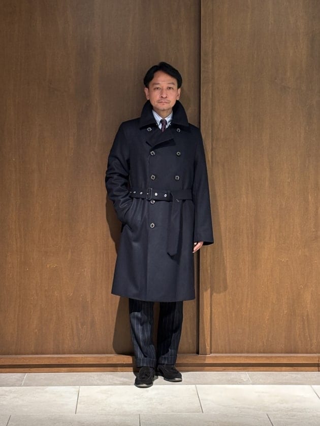 着用イメージです。スーツの上にNAVYカラーのサイズ36を着用しております。やや袖丈が長いですが私は36が適正サイズです。適度に細身のシルエット。モダンでスタイリッシュなトレンチタイプですね。