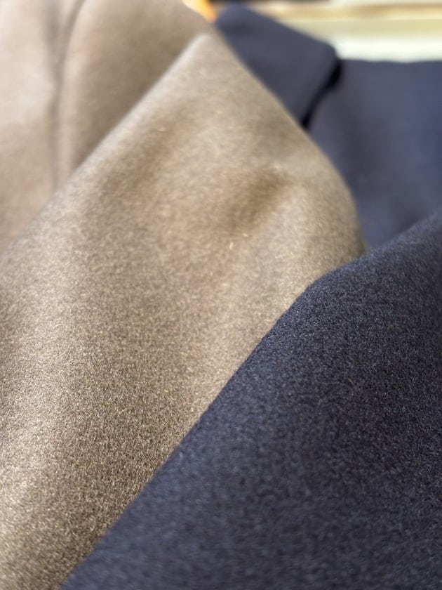 ビームス別注で生地を変更しております。ライトメルトン素材。ウール90%ナイロン10%です。メルトンにしては比較的軽めのタッチですが、ウールコートとして丁度良いくらいだと思います。