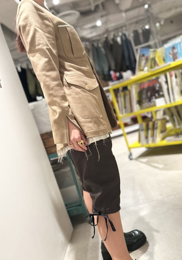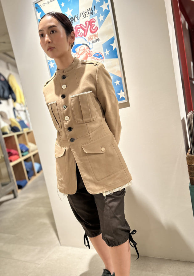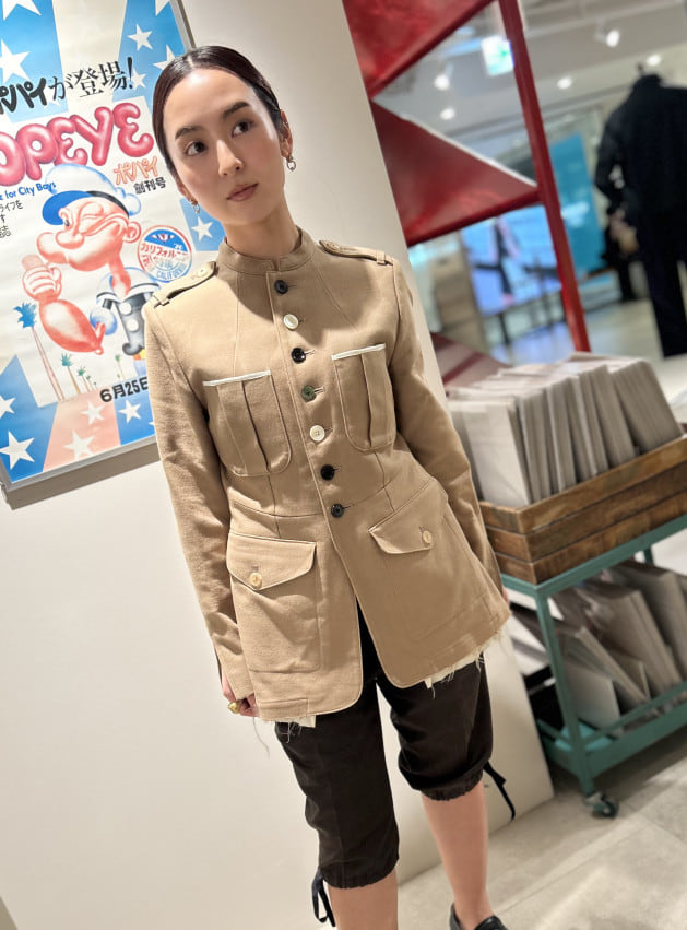 リサイクル品のジャケットをクレイジーボタン仕様にして、更にはフラップ外しやスリーブクラッシュ加工を施しました。