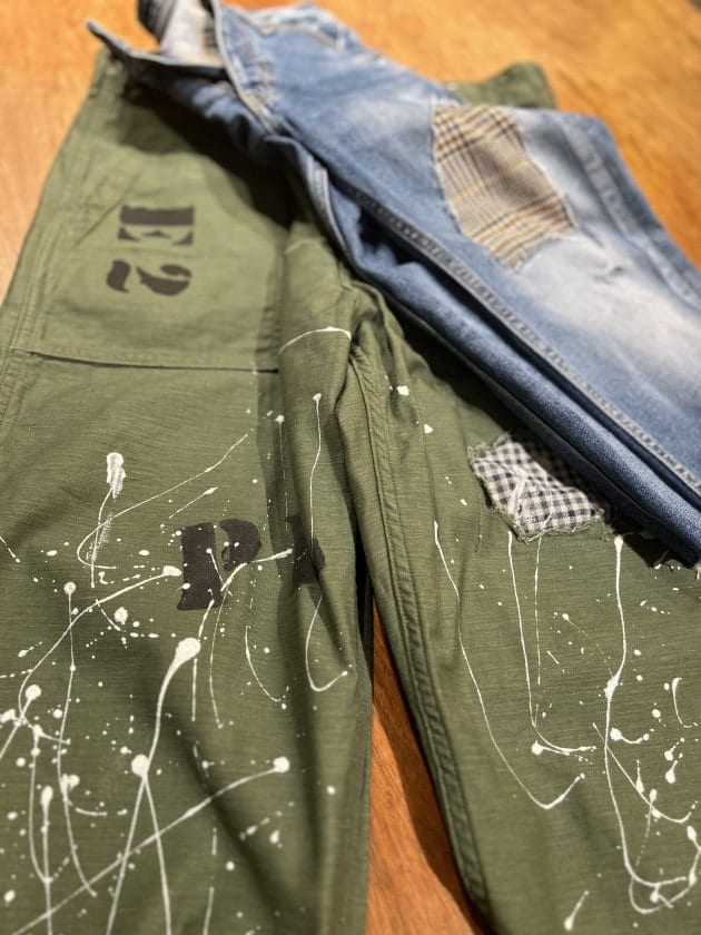 くたびれたメンズのハーフパンツをサイズ調整と裾ボロ加工、ペイント加工で古着感を大胆に。