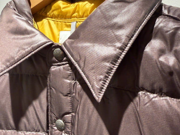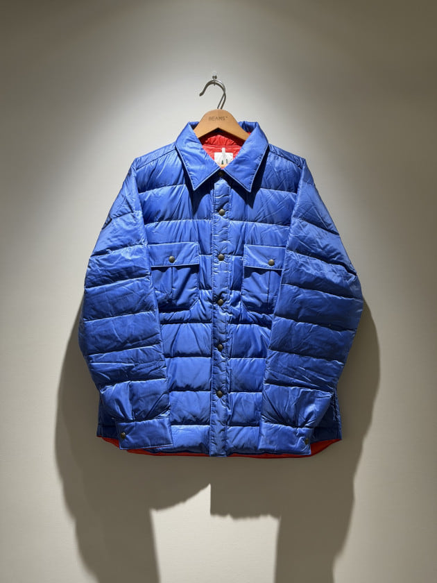 まずダウンシャツ自体は同ブランドからもリリースされていた。自分が見た事があるのは70s頃のもの。アメリカでアウトドアがスポーツとして認知され始め、様々なアウトドアブランドが台頭してきた時代。ダウンジャケットとなれば高山での山頂付近で着用されていたが、それまでの過程、つまり山道中は当然動く為、各ブランドがアクティブシーンに向けたダウンを開発。そのうちの一つがダウンシャツである。ダウンシャツは着脱を容易にした事、わた量を少なくする事で持ち運びの際の荷物軽減にも役立った。