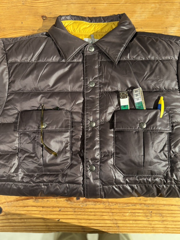 そして、以前の別注と大きく異なる点といえばここであろう。今回は650フィルパワーのダウンを使用しているが、ダウンシャツとしてボリュームを抑えたディテールにしている。嵩のあるダウンの保温効率を上げる為にパック状に小さく仕切る事でダウン量の偏りをなくし、全体的に高い保温性を確保している。また偶然の産物であるが、パック状である事でパッカブルのし易さも実現し、持ち運びのし易さにも一役買っている。