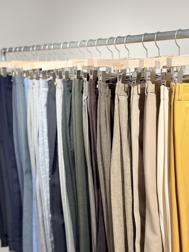 スラックスも生地感とサイズを意識して展開しています。
