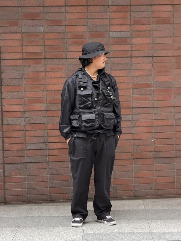 学生時代にアウトドアブランドでも働いていた経験のあるスタッフKATSUMI。プライベートでもアウトドアマンであるKATSUMIは今回"Urban Outdoor"をテーマにスタイリング。ミリタリーアイテムをチョイスしながらも、全身をBLACKで統一する事でモダンさと武骨さを共存。足元にVansをチョイスする事で軽快さを見せた。