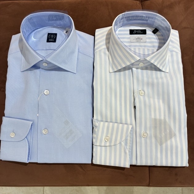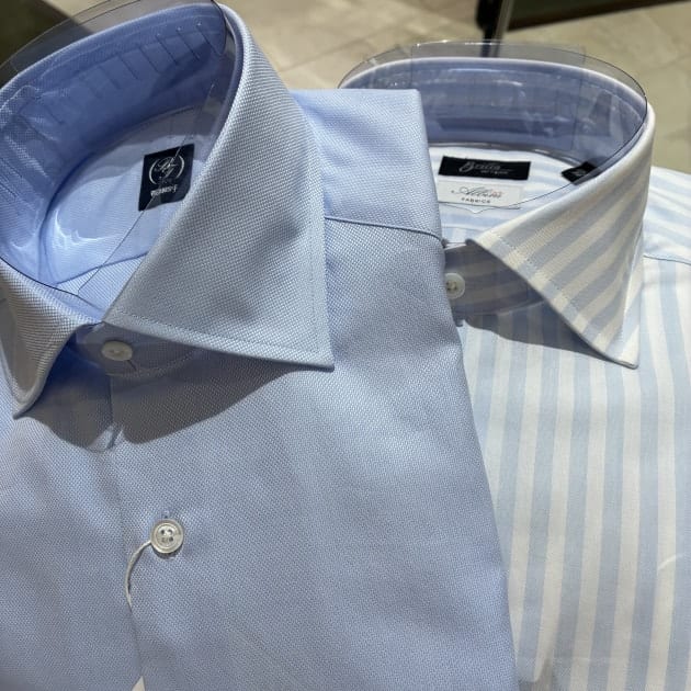 左側の「BEAMS F」のワイドカラーと比べると、少しだけ襟が小さめです。