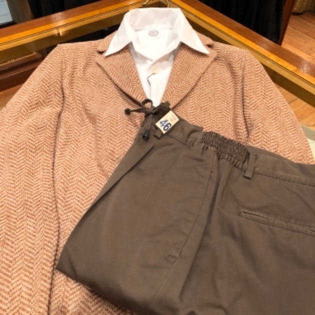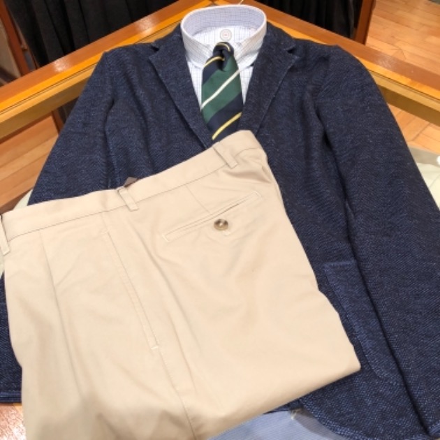 ネイビージャケット、クラブタイ、ベージュのチノパンと王道の組み合わせです!