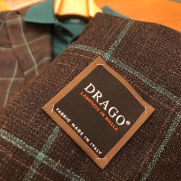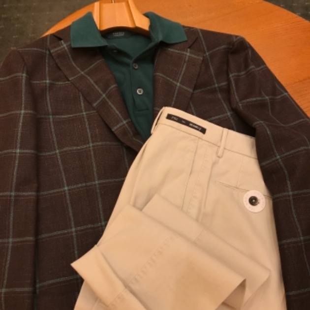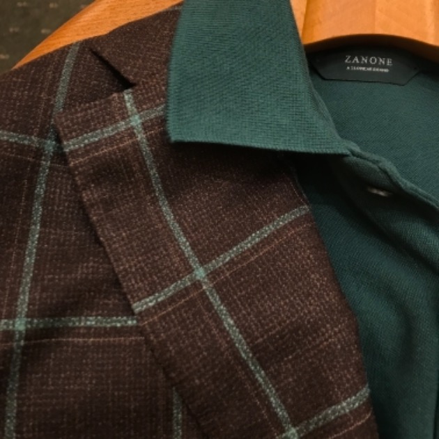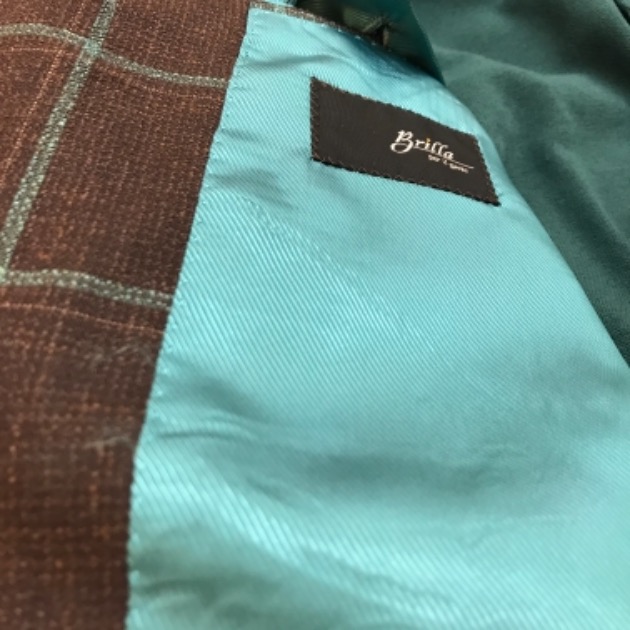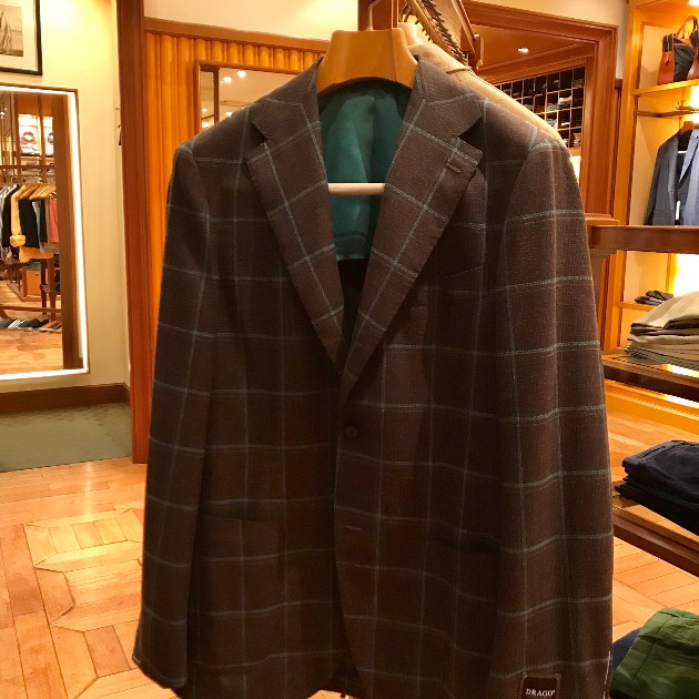 ブラウンにミントグリーンのようカラーのペーンが走る、洒落た生地ですね!