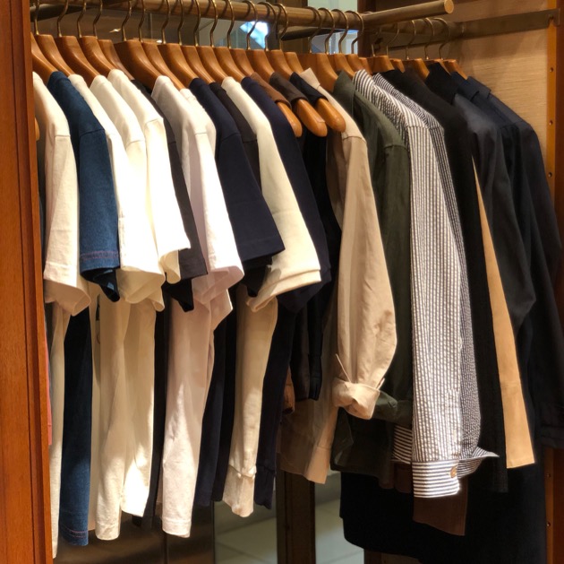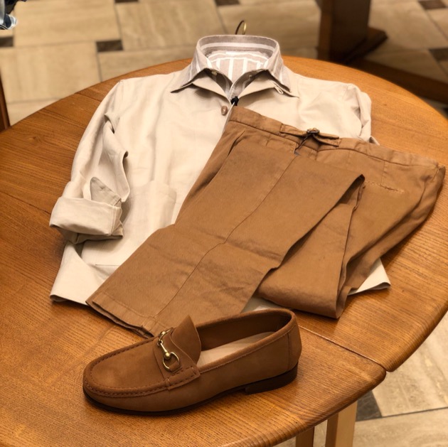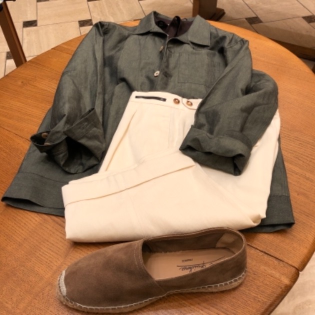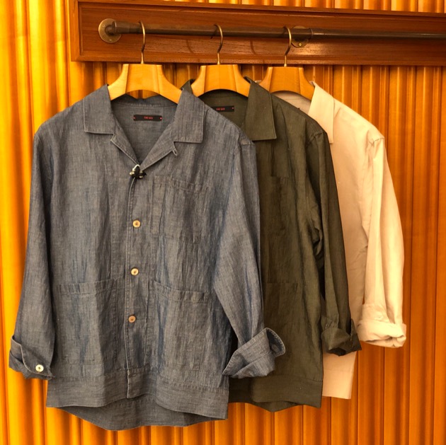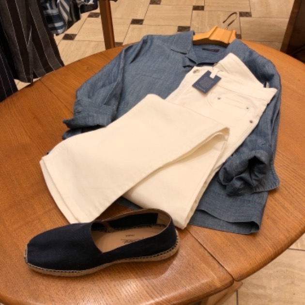 オープンカラーの解放感とシャンブレーの生地感がマッチしています。