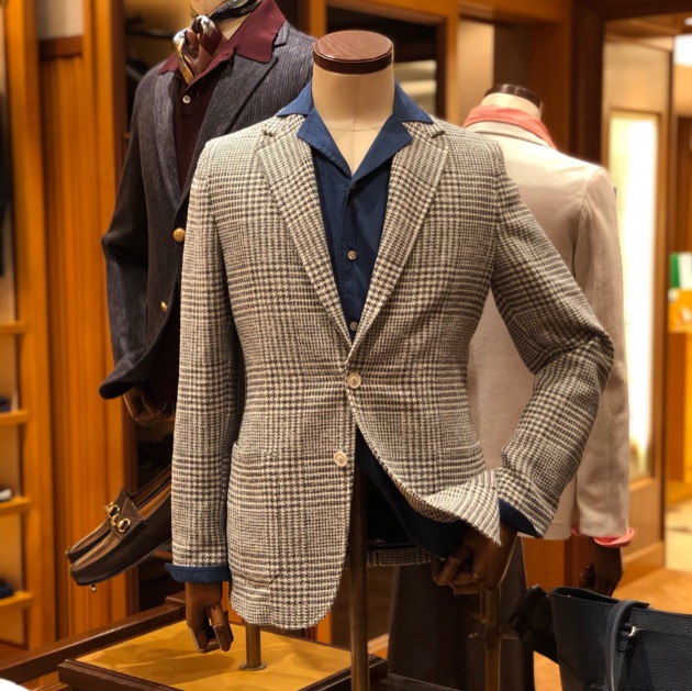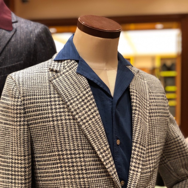 グレンプレイドのライトジャケットにブルーのオープンカラーのシャツを襟出ししたスタイル。