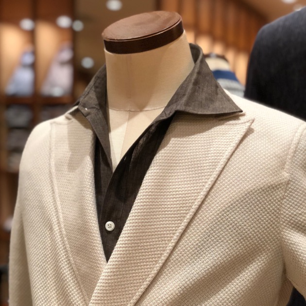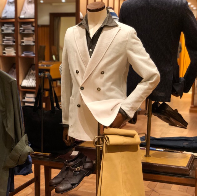オフホワイトのダブルのカジュアルジャケットにブラウンのリネンのシャツをこれまた襟出ししたスタイル。パンツはくすんだマスタードカラーのコットンパンツ、足元にはグルカサンダルです。