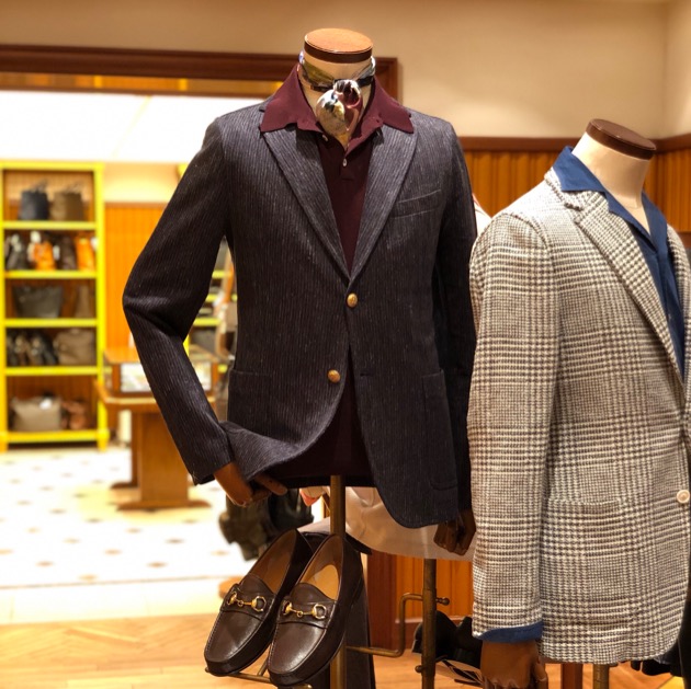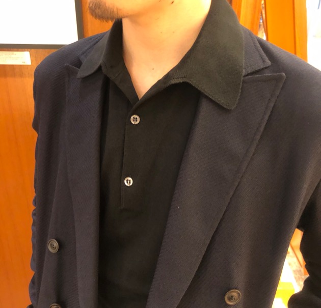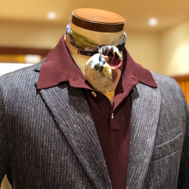 ネイビー×ブラウンのジャカードのジャケットにボルドーのニットポロを襟出ししたスタイル。