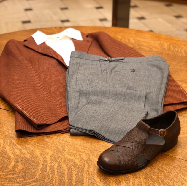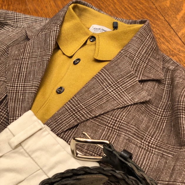 ブラウンのグレンプレイドのサファリジャケットにナチュラル色のパンツ、差し色でマスタードのニットポロを合わせたスタイル。グルカサンダルを敢えてブラックにすることでモダンな雰囲気になっていますね!