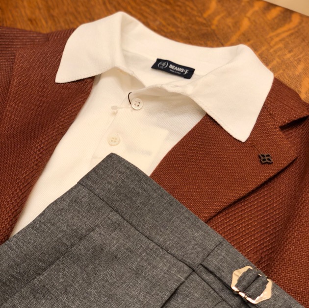 テラコッタカラーのジャケットにベルトレスのグレースラックス、ホワイトのニットポロを合わせたリラックススタイル。敢えてドレッシーなワイド目のスラックスに、ニットポロを襟出ししていて非常にこなれたコーディネートです!
