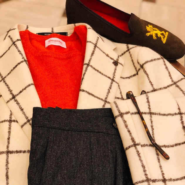 オレンジのクルーネックニットがアクセントのカジュアルスタイル。ウールパンツで上品に合わせているのもポイントですね!