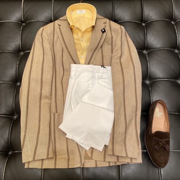 クラブストライプと聞くと派手な印象を思い浮かべますが、こちらは間隔の広い、落ち着いたルックス。リネン100%の乾いた質感とのマッチングも良い感じです。