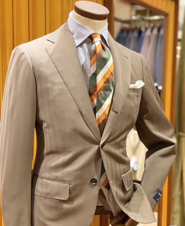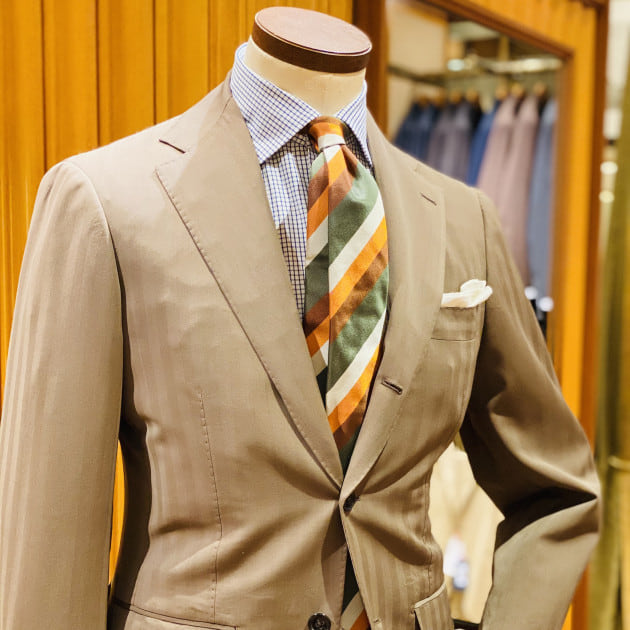 ソラーロスーツにストライプタイの定番コーディネート。オレンジやグリーン、ネイビーなど、色を使って新鮮な雰囲気にしています。うるさく見えないのは、色のトーン、柄を上手く調整しているからですね!