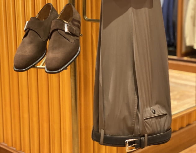 シューズはブラウンスエードのシングルモンク、ベルトも同じくブラウンスエード。