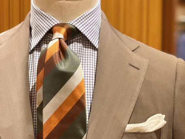 オレンジ、グリーン、ブラウンと、多色使いのタイですが、スーツの生地の色と相性が良く、他のアイテムも抑えめに合わせているので、非常に馴染んでみえます。ネイビーのシャツもボヤけたコーディネートに見せないポイント。