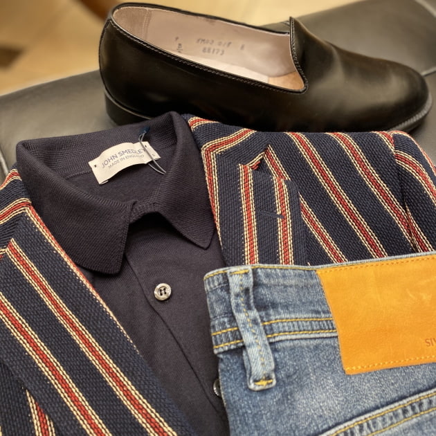 こちらはニットポロを合わせたオフスタイル。