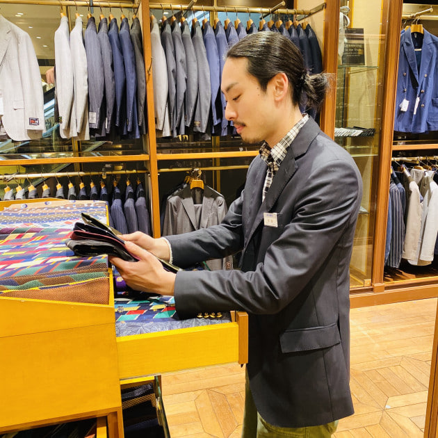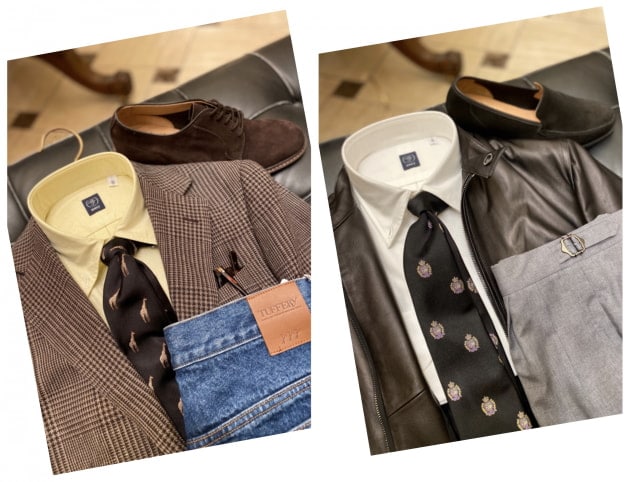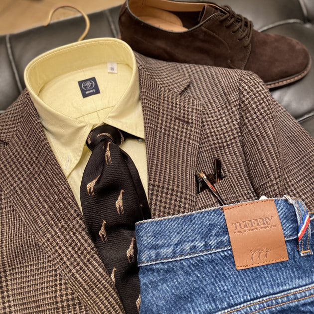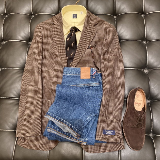 ブラウンベースの合わせに、タイでブラックを挿すことで野暮ったくなりすぎず、モダンな雰囲気に。タイのモチーフにもブラウンが入っており、まとまりのあるコーディネートです。デニムも色落ち具合が丁度良いセレクトですね。キリンからイエローのシャツを引っ張ってきているあたりに洒落を感じます。