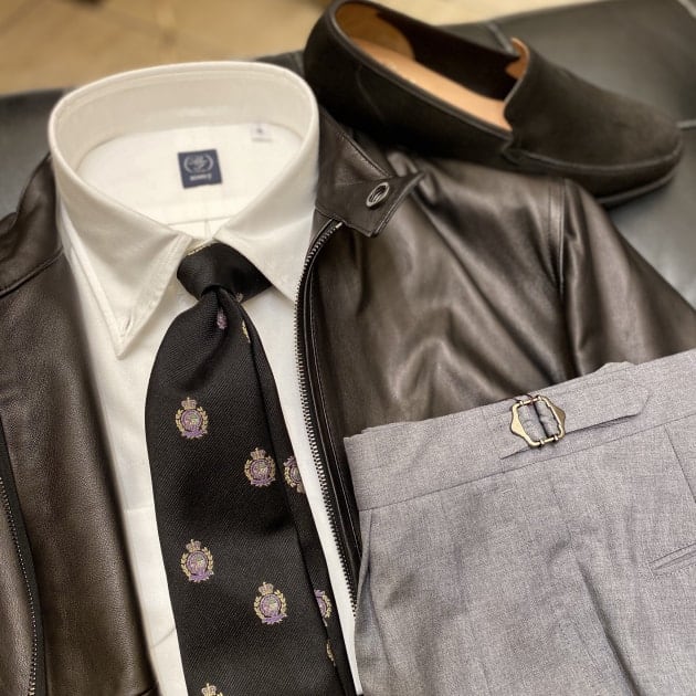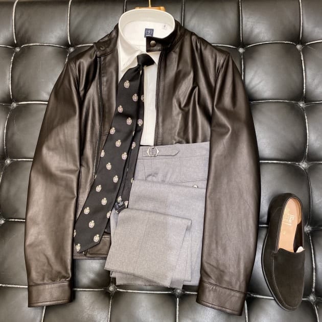 モノトーンで仕上げてみました。ライダースにタイドアップというスタイルなので、タイ以外は柄を使わず、とことんシンプルに構成しています。
