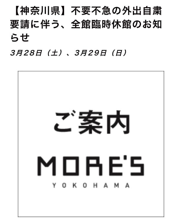 神奈川県、不要不急の外出自粛要請に伴い、横浜モアーズは3月28日(土)、29日(日)の2日間、全館臨時休業となります。詳しくはこちらをご確認ください。