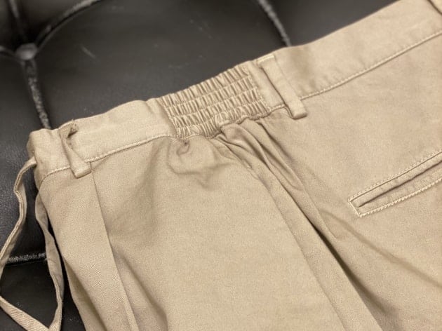 シャーリング仕様なので、ウエストのフィッティングも楽ちん。後染めの色合いも良い感じです。