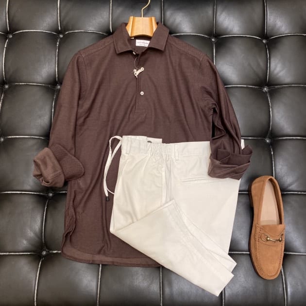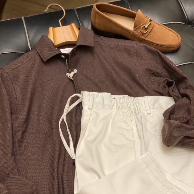 ポロシャツに合わせたシンプルなスタイルもおすすめです。