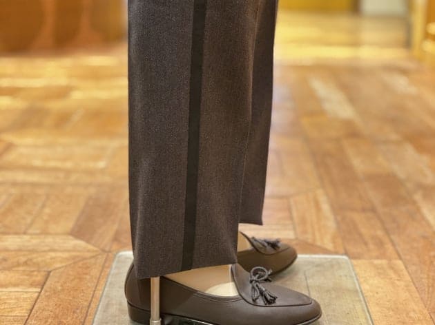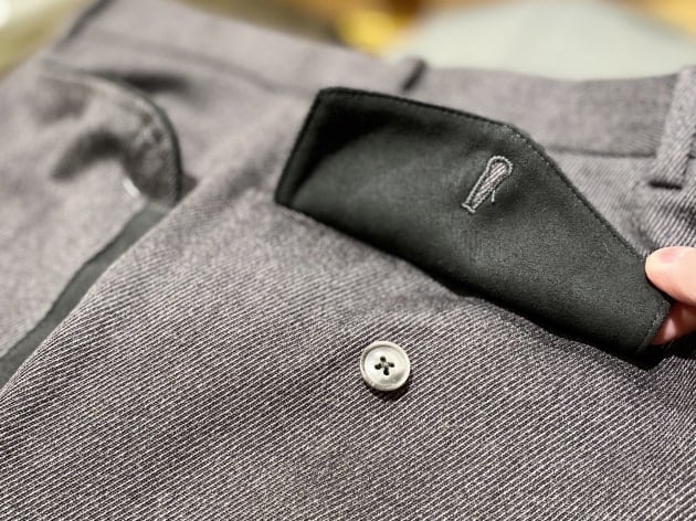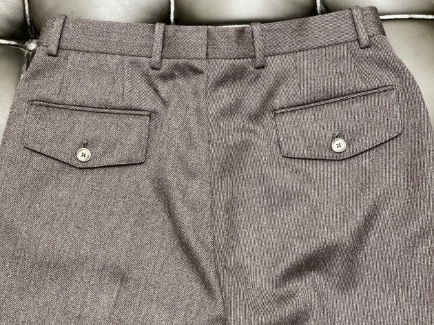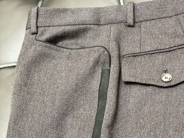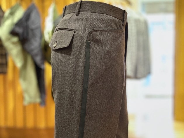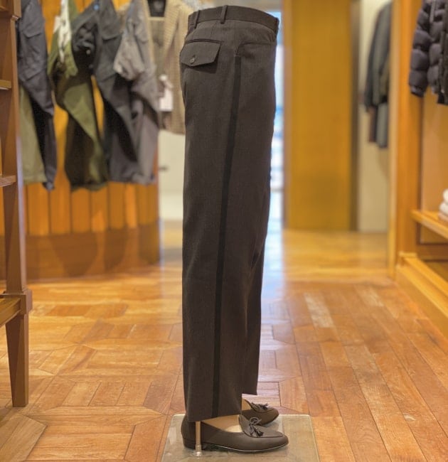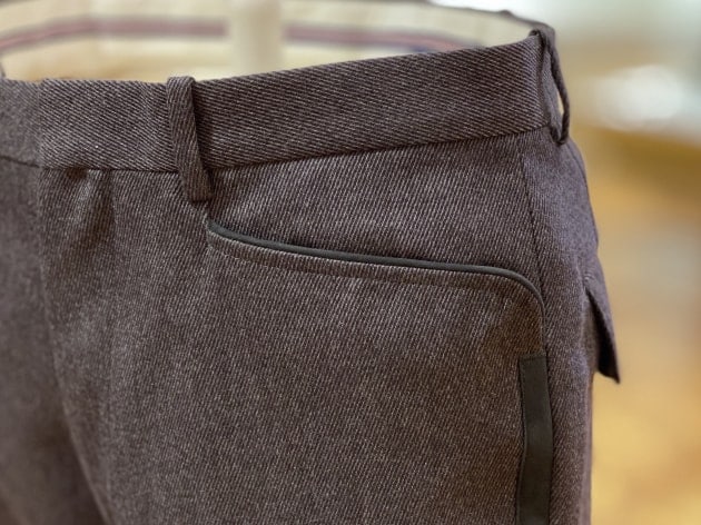 このパンツの特徴はなんといっても「エルポケット」と「側章」。スポーティなディテールとドレッシーなディテールのミックスが雰囲気のある表情に。ポケットにはパイピングが施してあります。