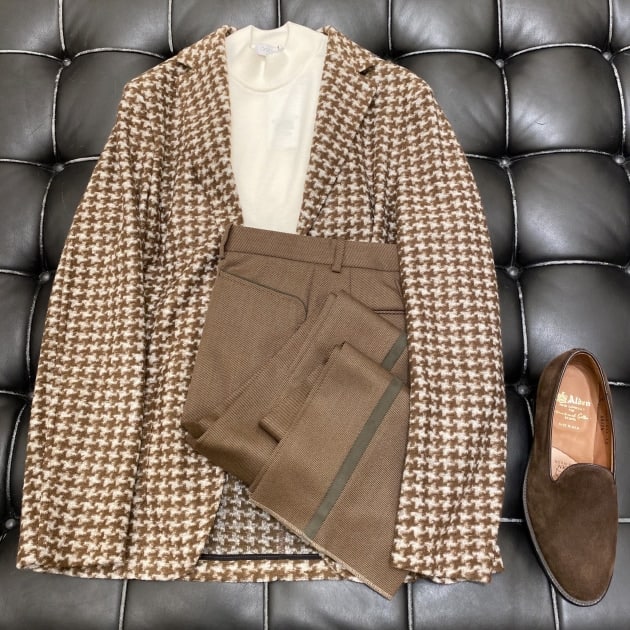 ブラウンはジャケットスタイルに合わせてみました。カジュアルな軽めの合わせも、上品な雰囲気に仕上げられます。
