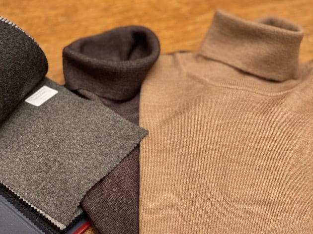 タイドアップはもちろんですが、タートルネックニットを合わせてカジュアルに着ても良いですね。ビジネスだけでなく、オフにも着用できます。