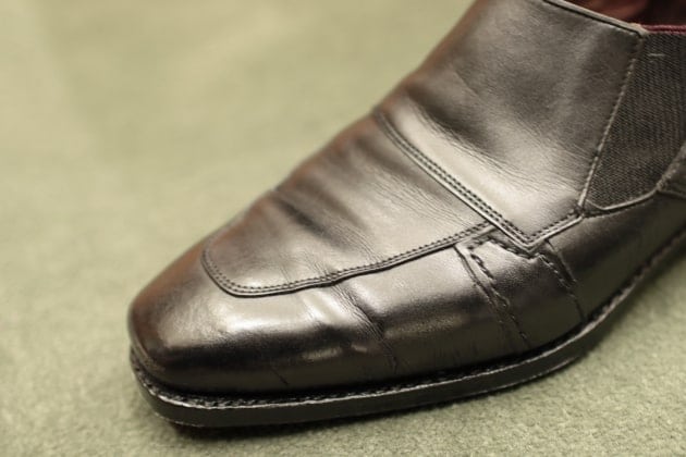 レザーシューズを履き込んでいくといつかは起こる「クラック(ひび割れや裂けのこと)」。その部分に皮を当て込んで修理します。「そこまでして履く?」と言われればそれまでですが、自分と一緒に歩んできた相棒は簡単には捨てられません。愛着が沸くんですよね。