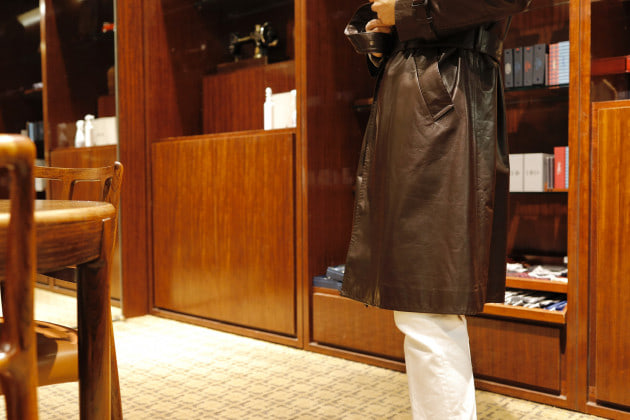 レザーのロングコートというと少し古臭い印象があるかもしれませんが、こちらはシルエットをモダンにアップデート。細めにとられたアームや、