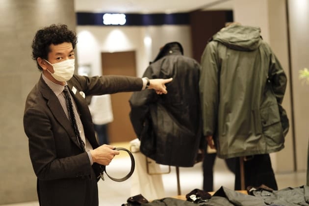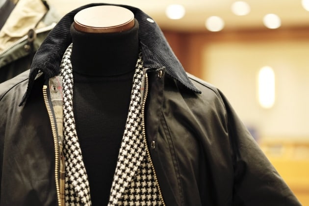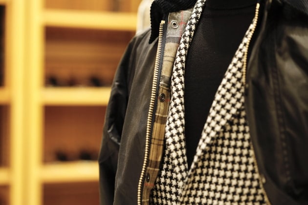 都会的なモノトーンなVゾーンに、粗野なオイルドコートのミックス感が非常に気分。