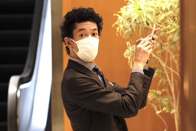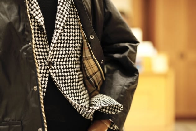 ネイビーのオイルドコートに白黒ハウンドトゥースのジャケット、ブラックのタートルネックニット。
