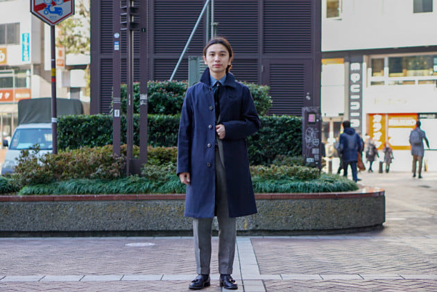 170cm、58kgの痩せ型なフミくんは、スーツの上からサイズ36を着用しています。