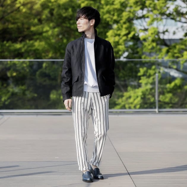 身長171cmのスタッフ反端でサイズは36を着用。ホワイトのニットとストライプ柄のイージーパンツでモダンなリラックススタイルに。