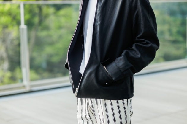 特徴的な襟は寝かしても良い感じです。着こなしに変化をつけられますね。