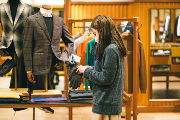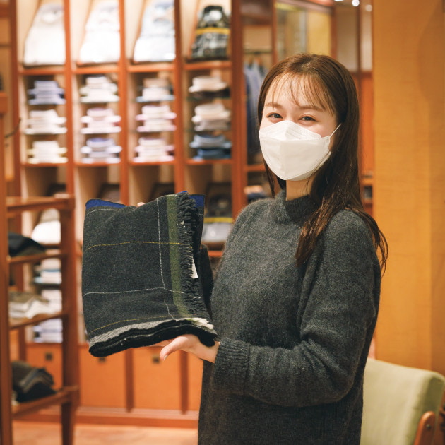 こちらはラムズウールにカシミヤをブレンドし、ふわっと柔らかな質感に。品のある配色のチェックも大人の雰囲気が漂います。